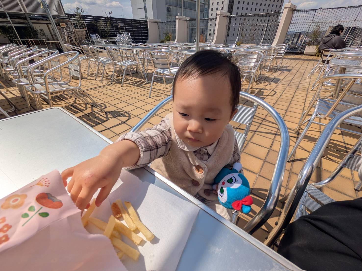 子どもはハンバーガーを食べられないのでポテトで我慢してもらいます![]()