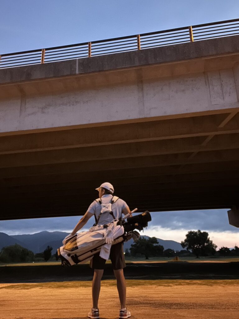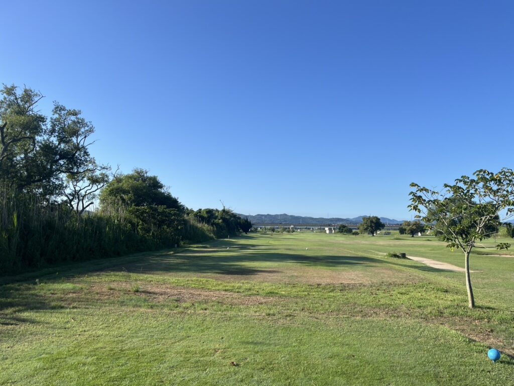 最初にスタートした、からさで大橋へ向かっていくホール(※右が1番ホール)。ティーショットの狙いは、からさで大橋のふたつの橋脚のちょうど中間くらいで。