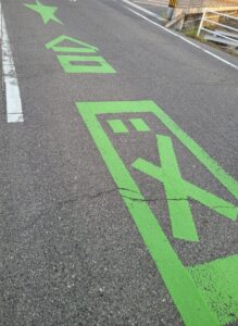 少し調べてみると、路面標示の中で「法定外標示」という分類に入り、見通しの悪い場所、生活道路や通学路の安全確保などのために全国で数多く設置されているそうです。(代表例「止まれ」など)