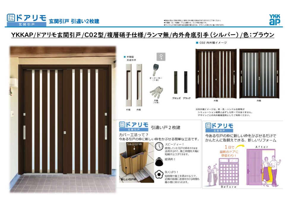 【メーカー】YKKAP 【商品名】ドアリモ玄関引戸 C02型 【仕 様】複層ガラス仕様 【製品色】ブラウン |