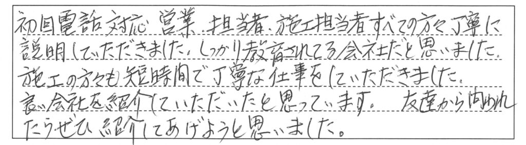 初回電話対応、営業担当者、施工担当者すべての方々丁寧に説明していただきました。しっかり教育されている会社だと思いました。