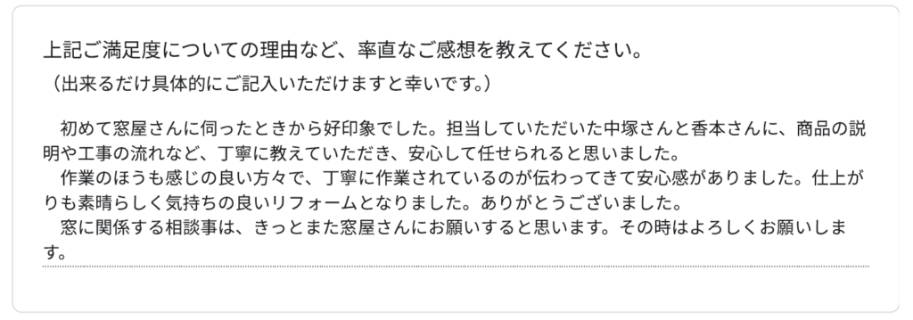 他社さんも含め検討させていただきましたが、スタッフさんの人柄や対応、見積書等から信頼できる会社だと感じ、窓屋さんに決めて、安心してお任せすることができました。