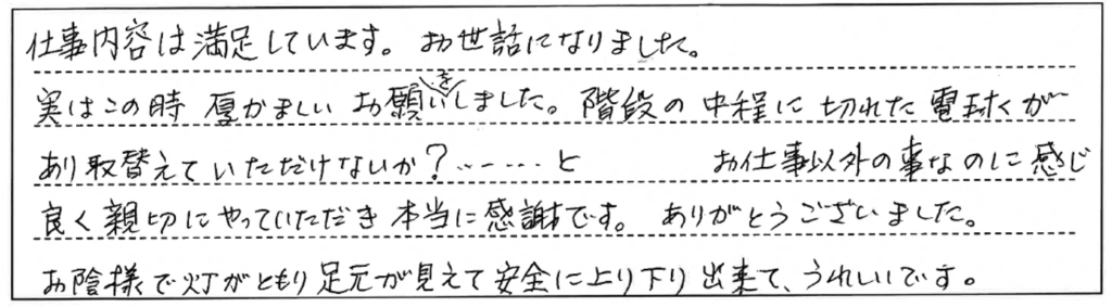実はこの時、厚かましいお願いをしました。階段の中程に切れた電球があり取替えていただけないか?・・・と。