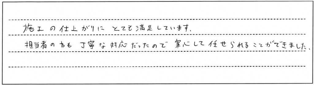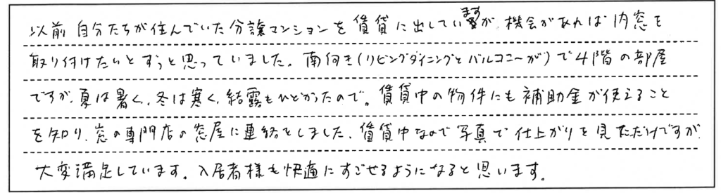 賃貸中なので写真で仕上がりを見ただけですが、大変満足しています。入居者様も快適にすごせるようになると思います。