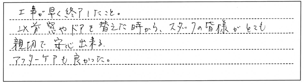 最初に下見に来られた方から当日施工してくださった方まで丁寧で大変好感を持ちました。施工もプロだけあって予定よりも早く終わり、とてもありがたかったです。また窓や玄関のことで何かあればぜひお願いしたいです。
