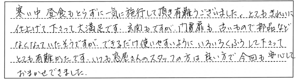 寒い中、昼食もとらずに一気に施工して頂き有難うございました。とてもきれいに仕上げて下さって大満足です。玄関もですが、門扉も古いもので部品などなくなっていたそうですが、できるだけ使いやすいようにいろいろ工夫して下さってとても有難かったです。いつも窓屋さんのスタッフの方は良い方で、今回も安心しておまかせできました。